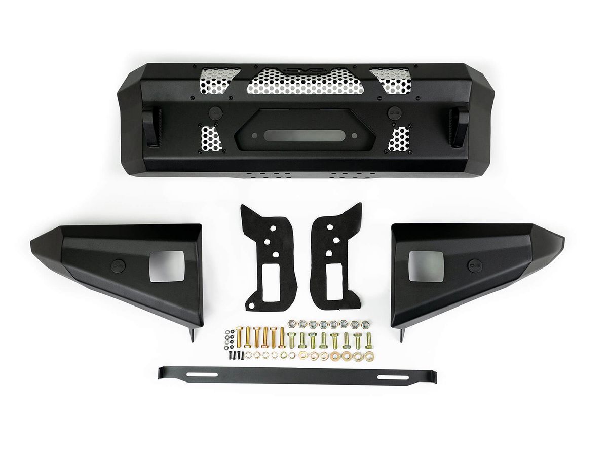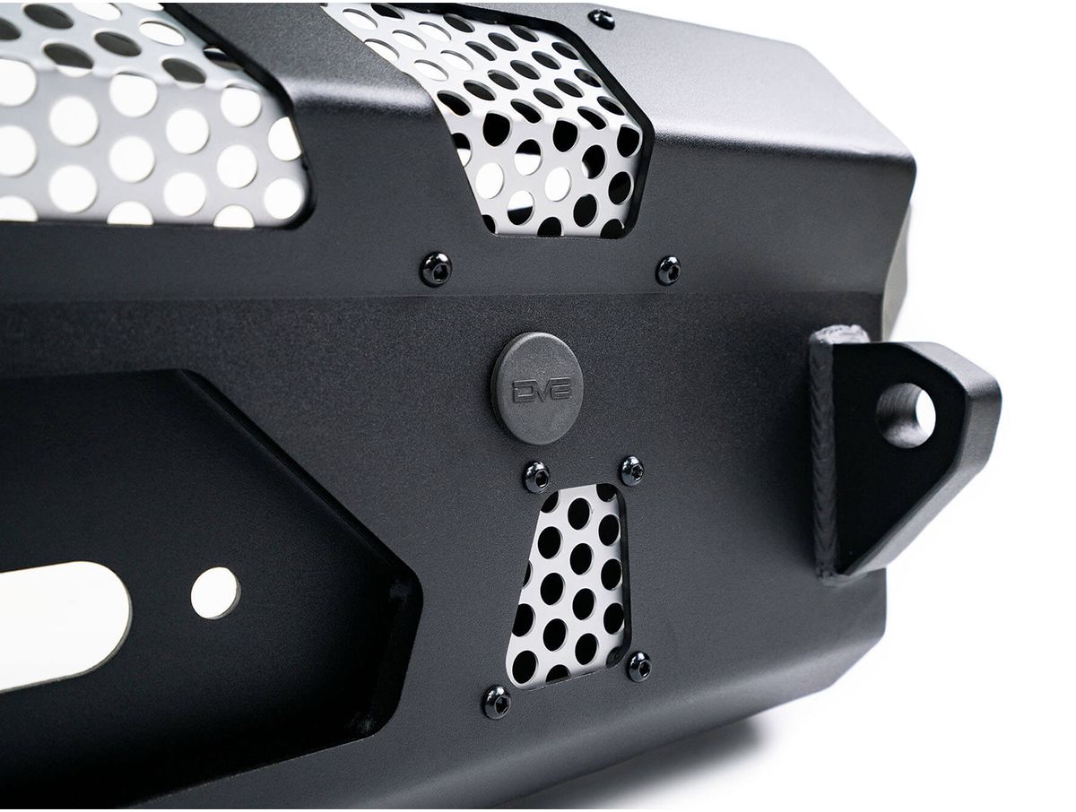 The recessed winch tray tucks neatly within the bumper, accessible through dual top-side openings, and fits up to a 12,000 lb. winch with ease. Skipping the winch? No problem. DV8 includes brackets to install a 20" single-row light bar behind the sleek perforated aluminum accent plate. Trail-tested and ready for more, this bumper is built to handle whatever lies ahead.