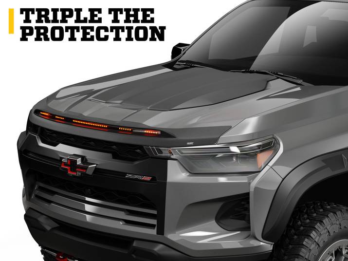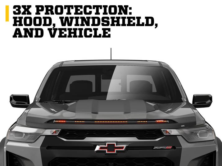 • 3x PROTECTION: HOOD, WINDSHIELD, AND VEHICLE. Built to guard your hood and windshield from rocks, chipping, and road wear, and to protect you with increased vehicle visibility. Our AeroLift design redirects debris up and over your glass while integrated LED lighting improves your visibility to other drivers.